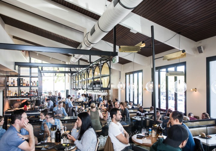 A mural of a woman by street artist Tarek presides over the spacious, polished diner, which Melbourne’s Studio Equator has fitted with lots of natural stone and gold accents.